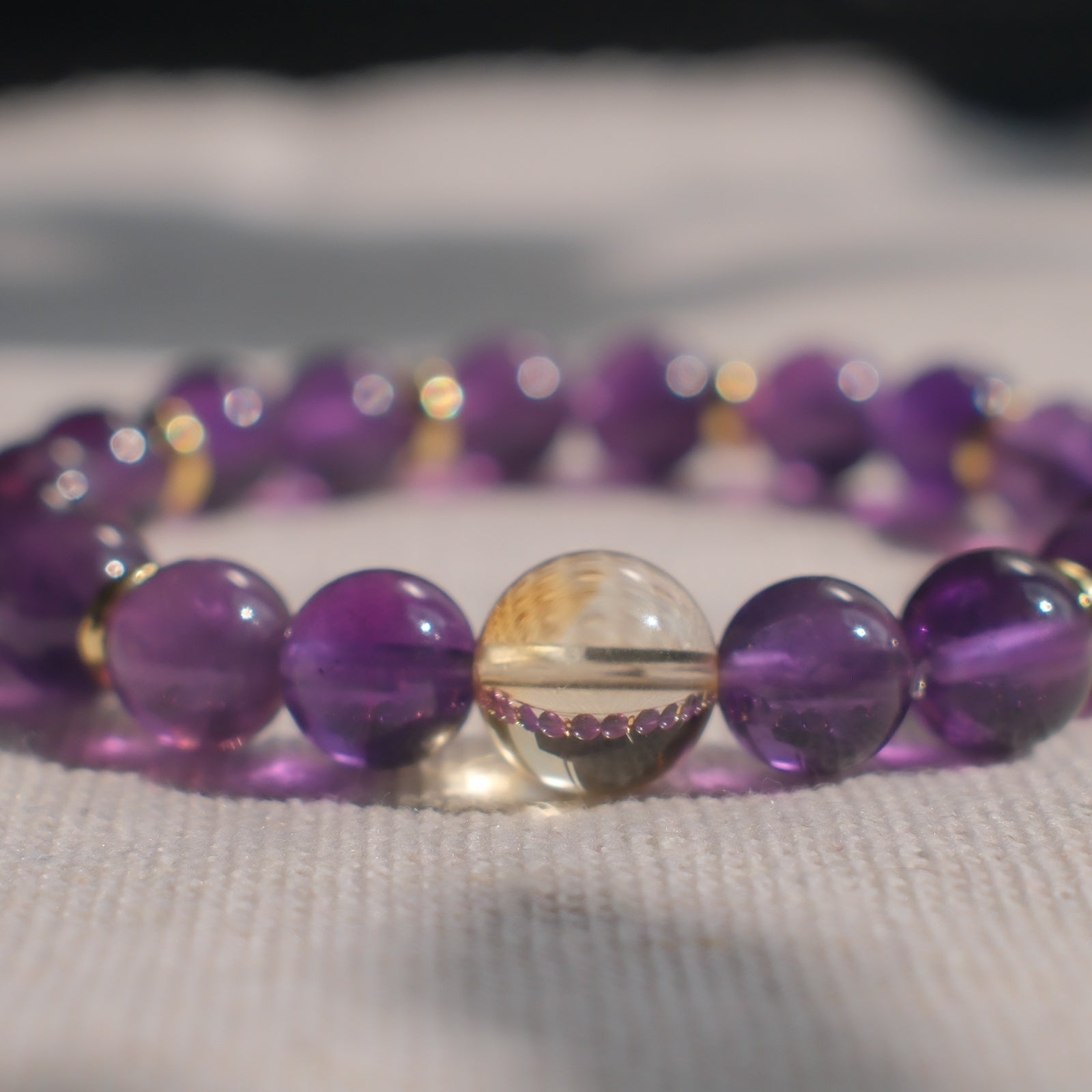 This bracelet features a blend of deep purple amethyst and a single golden citrine bead, accented with 14K gold-plated sterling silver spacers. Amethyst is a violet variety of quartz known for its calming and intuitive properties, while citrine, a golden quartz, is prized for its uplifting energy and connection to abundance.
