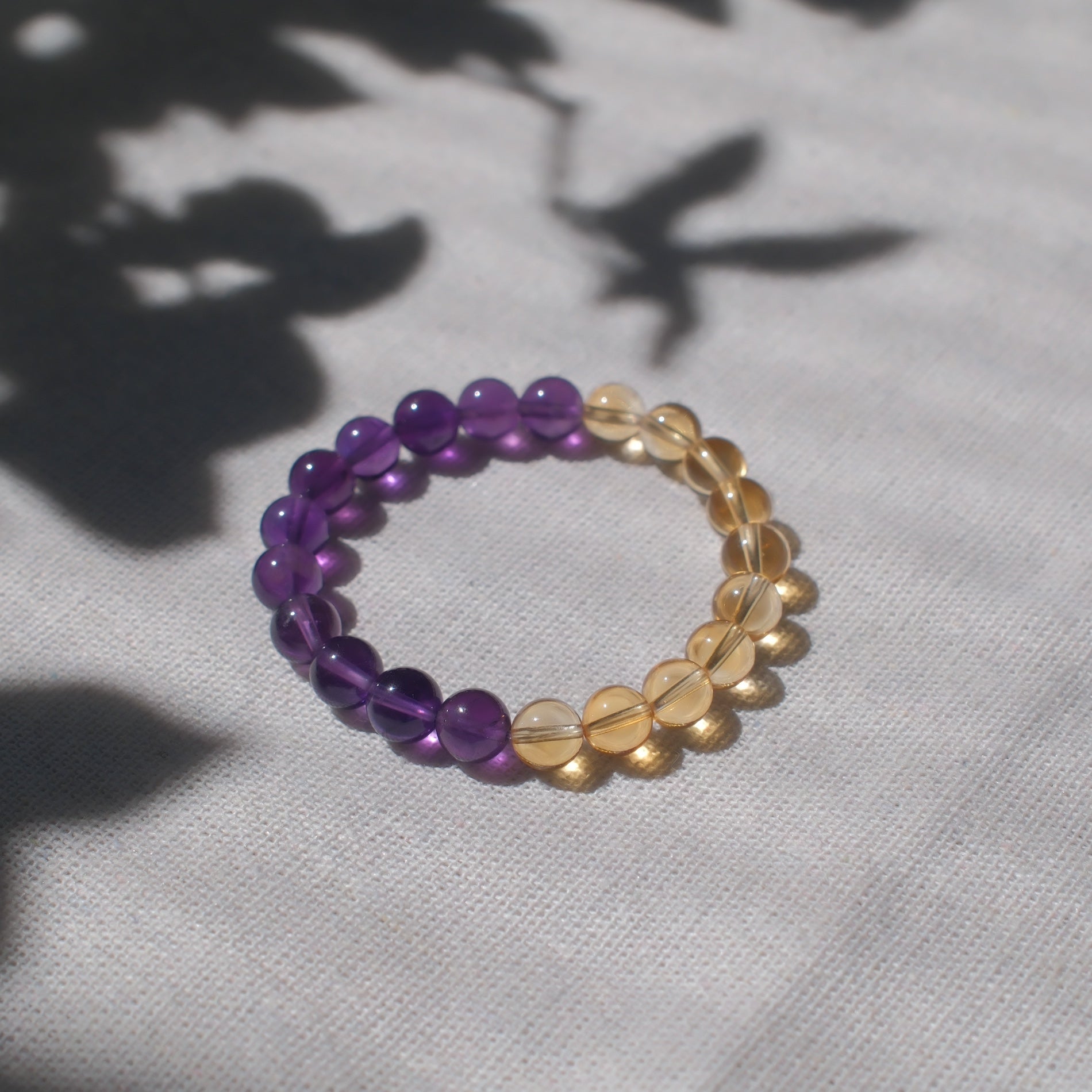 This bracelet pairs half golden Citrine with half deep violet Amethyst, creating a harmonious blend of warmth and calm. Citrine, a golden variety of quartz, is known for its uplifting energy, motivation, and connection to prosperity. Amethyst, a violet quartz, is treasured for its calming influence, emotional balance, and spiritual clarity. Together, they unite vitality with serenity, symbolizing the perfect balance of opposing yet complementary energies.