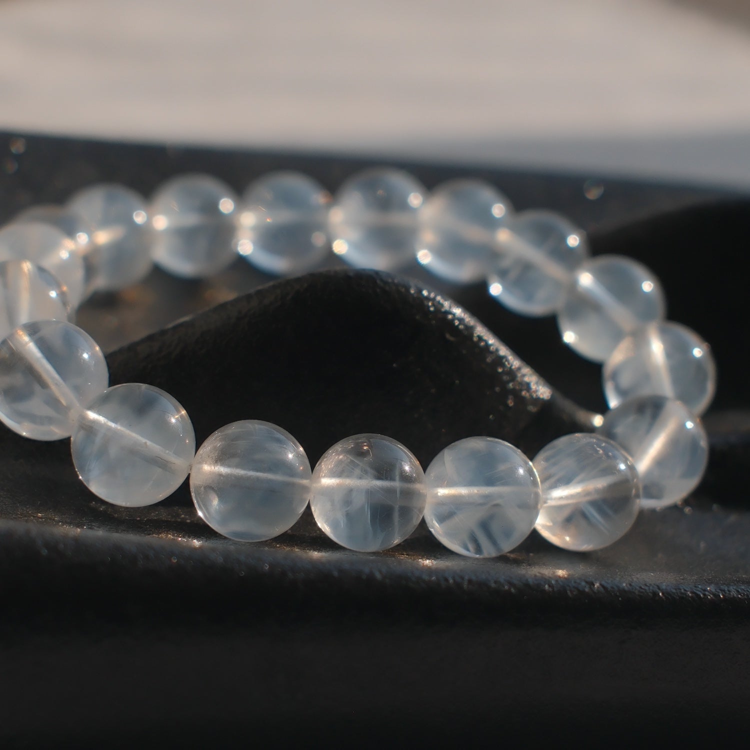 This bracelet features natural blue needle quartz beads with delicate, feather-like internal structures in soft milky-white layers that reveal a luminous blue sheen against a dark background. Blue needle quartz is a variety of quartz containing fine, blade-like or fibrous inclusions, creating its signature silky texture and shifting blue glow. It is believed to promote inner peace, enhance spiritual vision, and bring emotional balance.