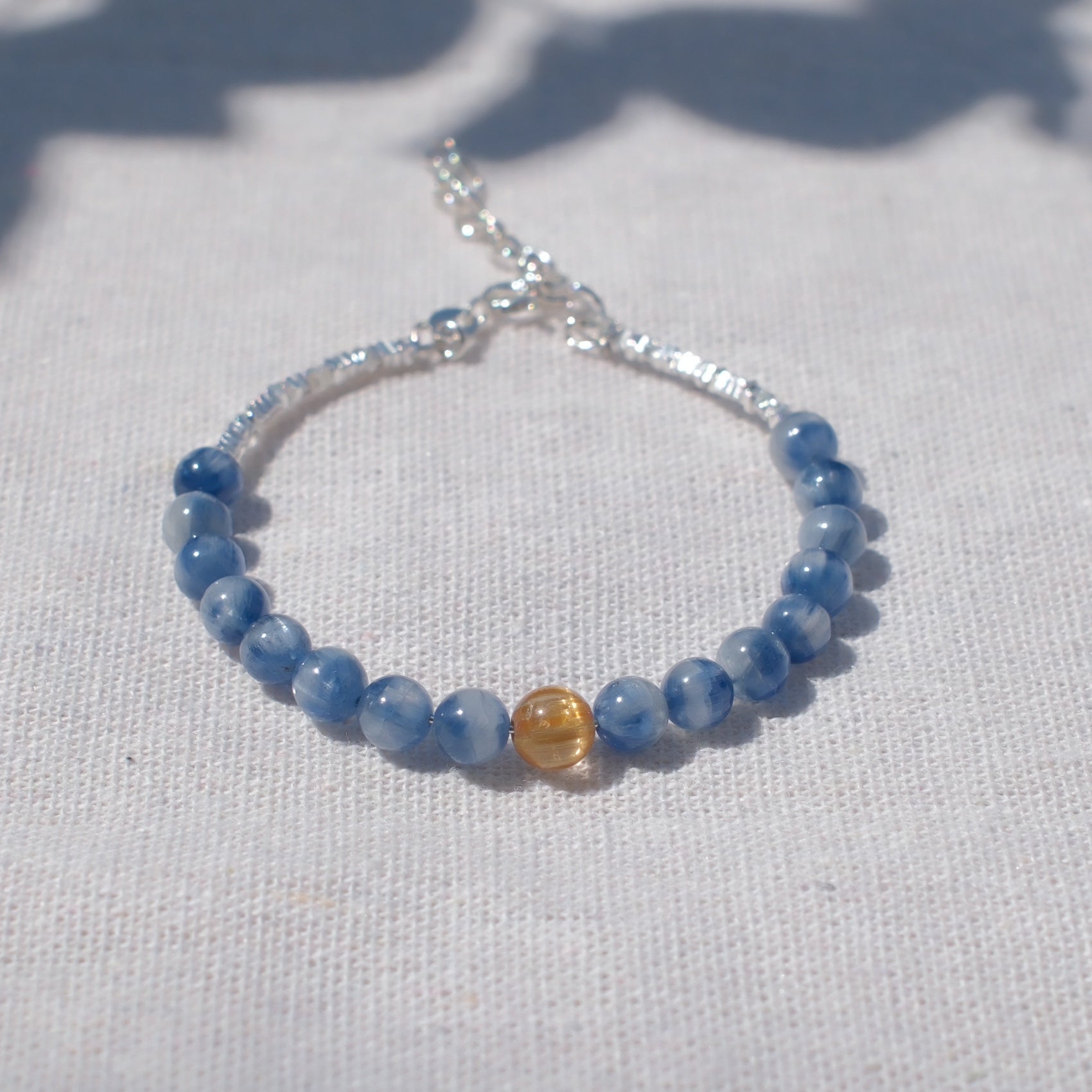 Kyanite is valued for its calming alignment energy, while citrine — a golden-yellow variety of quartz — is cherished for its uplifting, prosperity-attracting qualities. Together, they create a dynamic harmony of balance, clarity, and abundance, with silver accents adding a modern, refined touch.