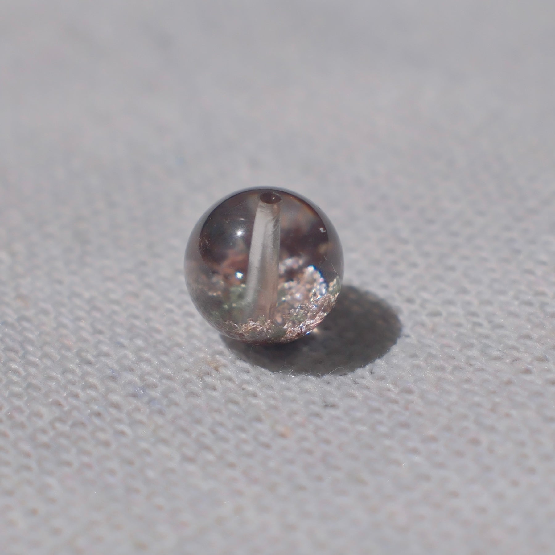A natural Brazilian Bowl-Shaped Phantom Quartz bead, featuring a soft blush-pink crystal body with a vivid green phantom inside. The crystal is highly transparent, smooth, and nearly flawless, symbolizing harmony between love and growth. The drilled design makes it ideal for pairing with bracelets or crafting into a pendant.