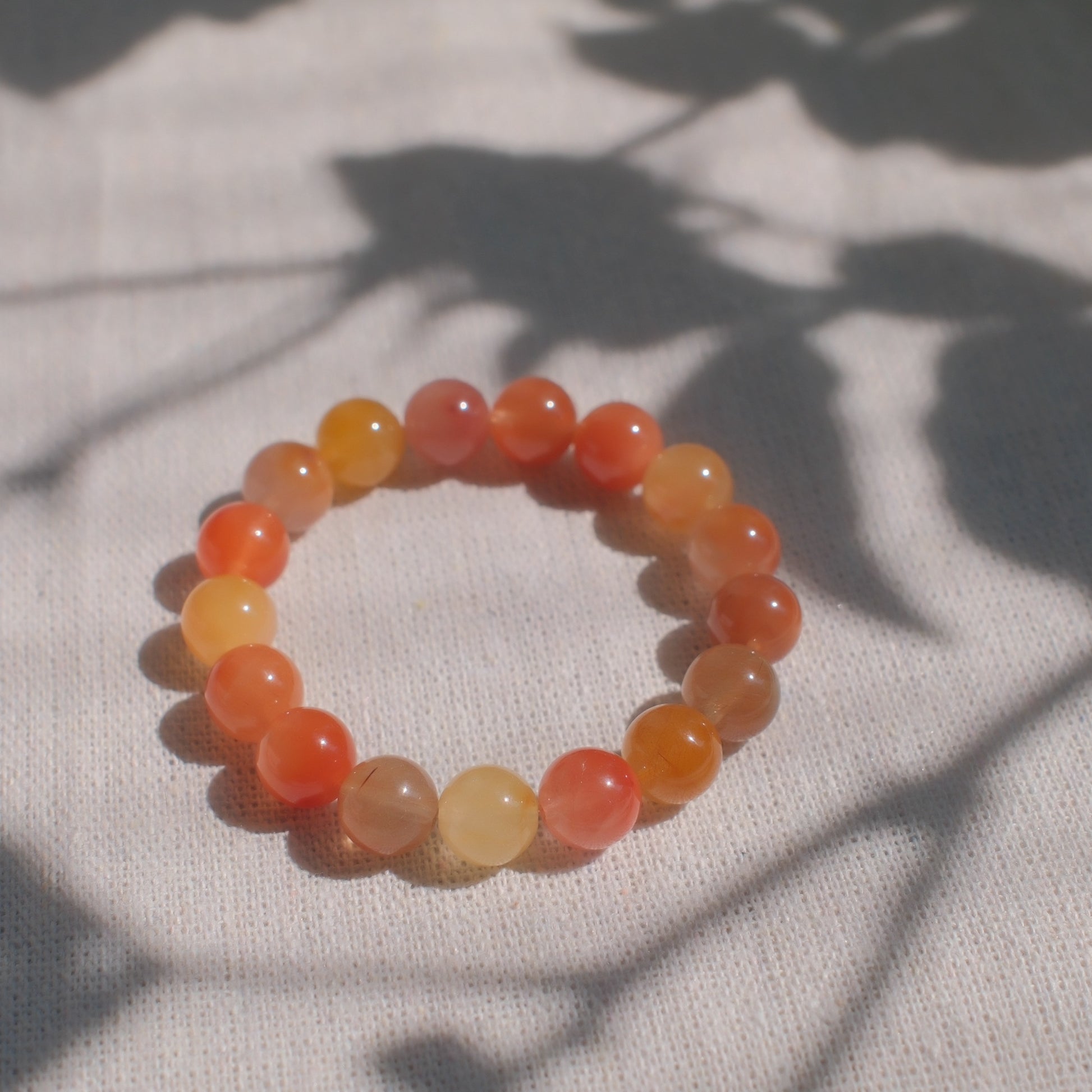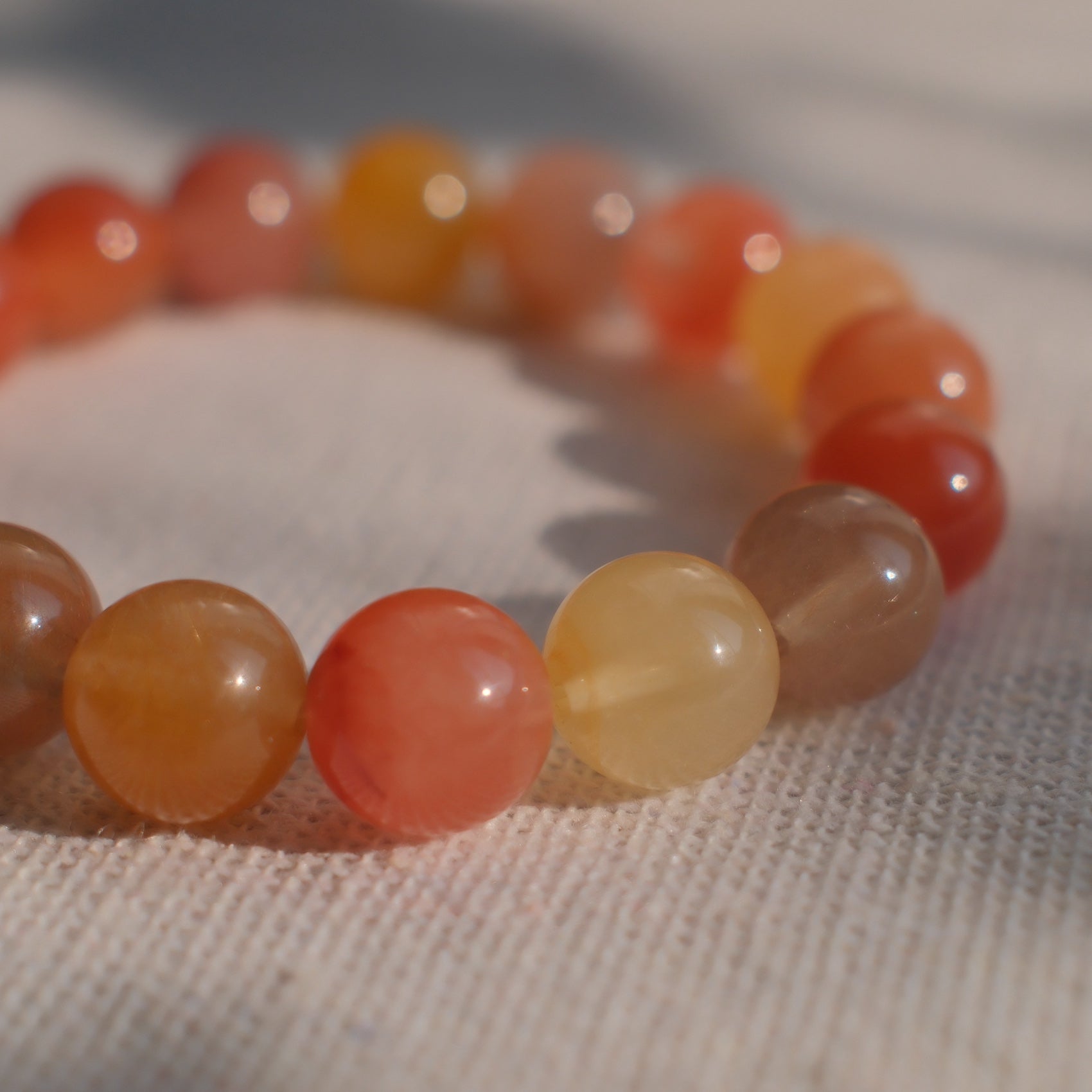 This warm-toned rutilated quartz bracelet comes from a rare old mine and features soft golden, amber, and peach hues. Each bead contains fine, golden-red strands that resemble rabbit fur — a natural formation treasured for its beauty and energy. Hand-strung with care, it helps balance your energy, restore vitality, and calm emotions.